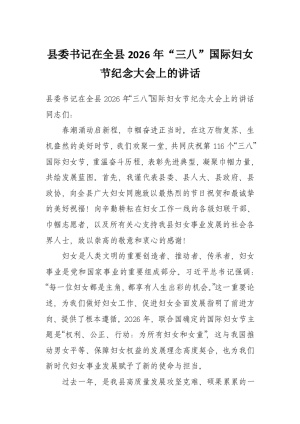 县委书记在全县2026年“三八”国际妇女节纪念大会上的讲话