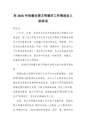 在2026年创建全国文明城市工作推进会上的讲话