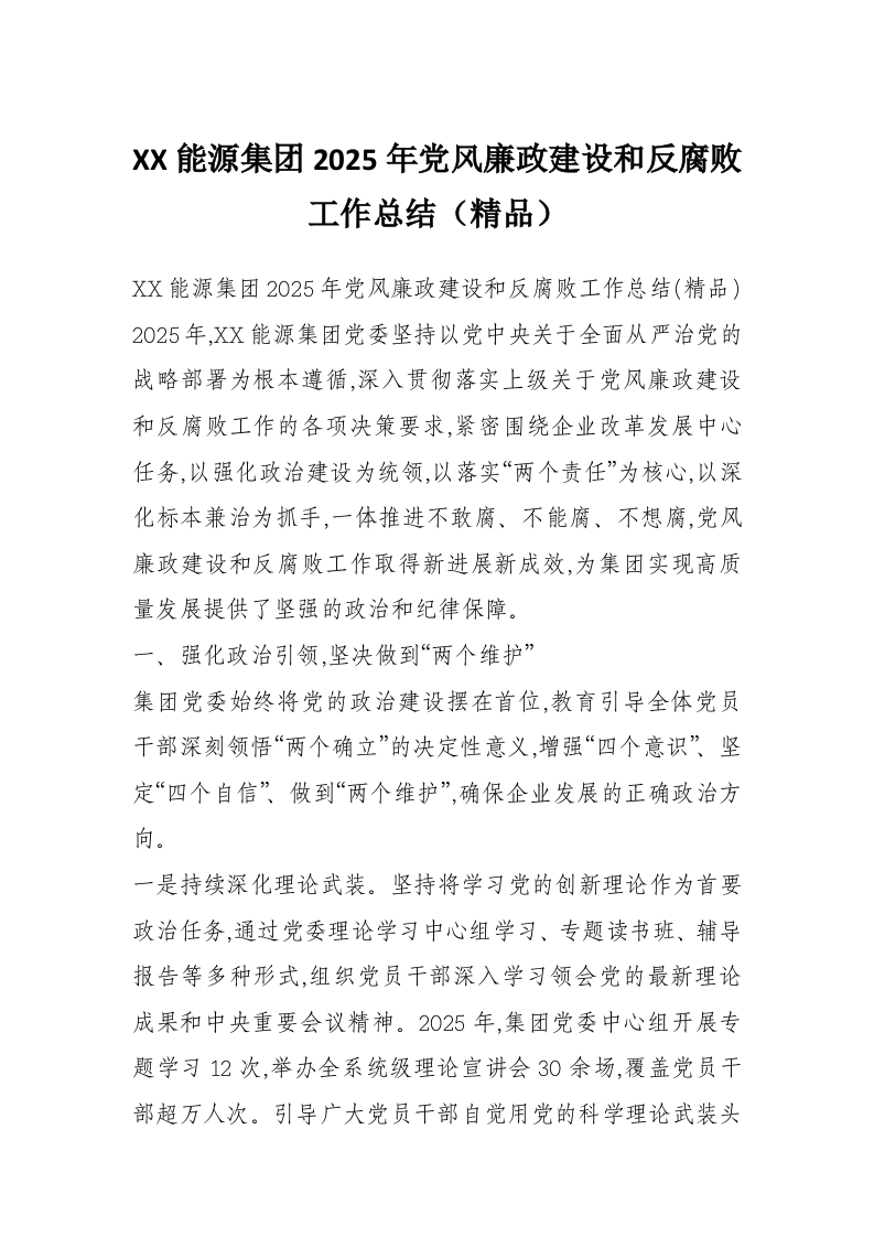 XX能源集团2025年党风廉政建设和反腐败工作总结(精品)