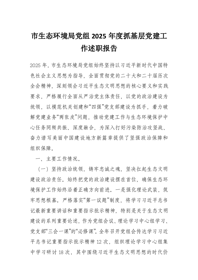 市生态环境局党组2025年度抓基层党建工作述职报告