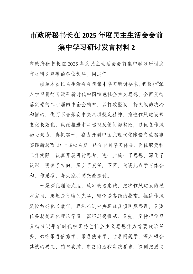 市***秘书长在2025年度民主生活会会前集中学习研讨发言材料2