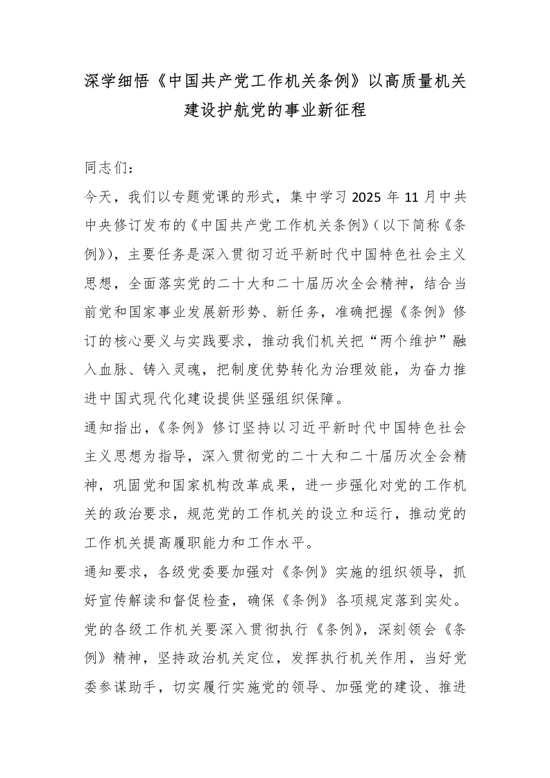 首页讲课讲稿深学细悟《中国***工作机关条例》以高质量机关建设护航党的事业新征程