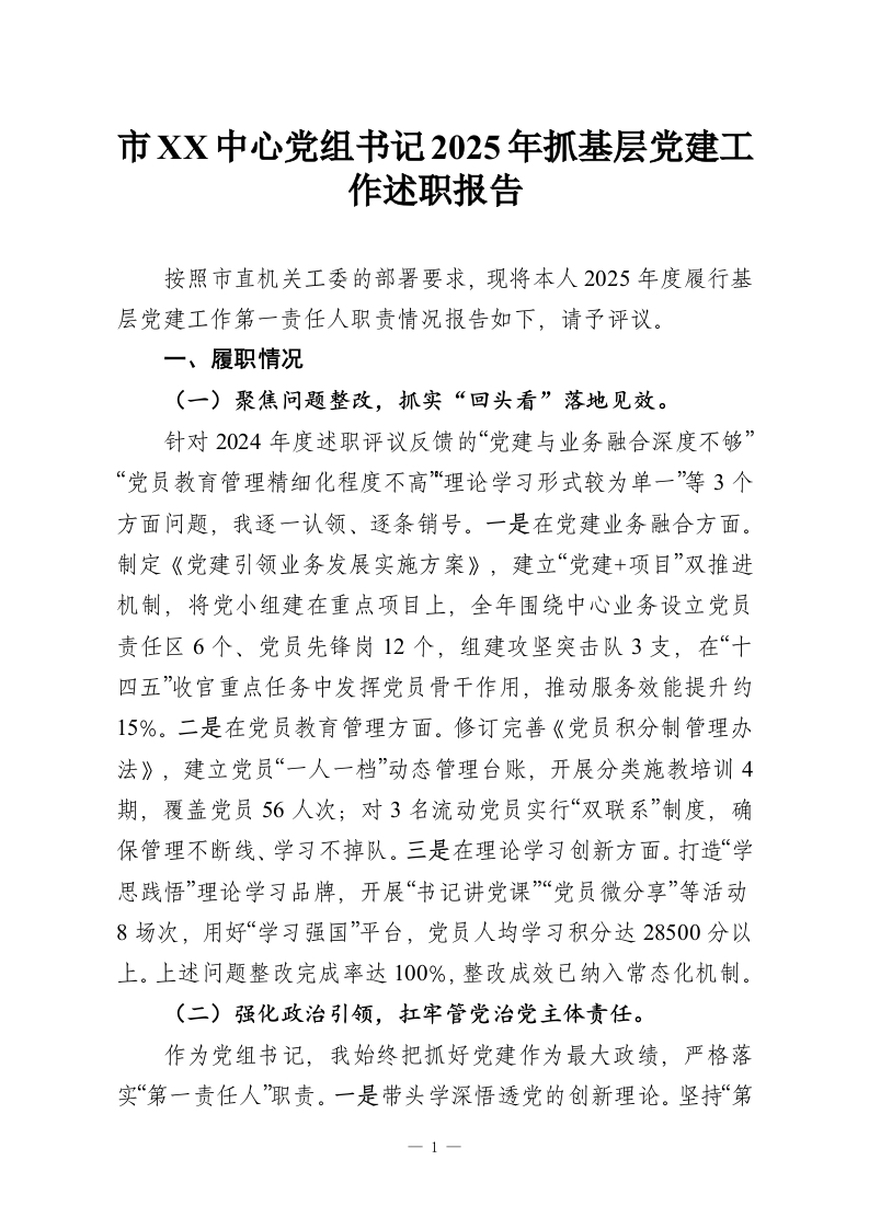 市XX中心党组书记2025年抓基层党建工作述职报告