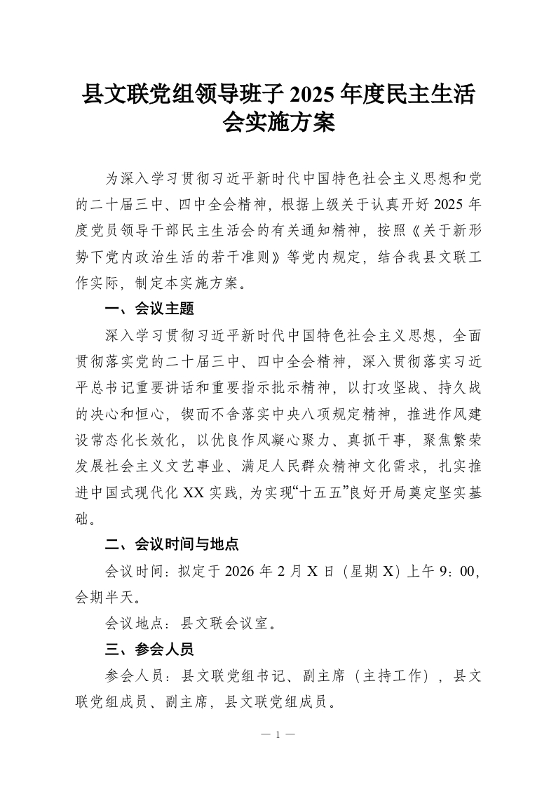 首页工作文档县文联党组领导班子2025年度民主生活会实施方案