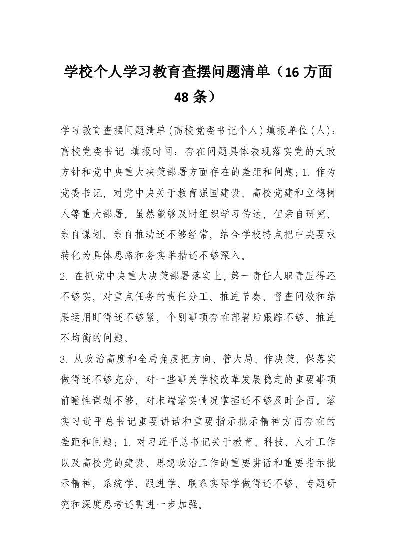 首页材料汇编学校个人学习教育查摆问题清单(16方面48条)