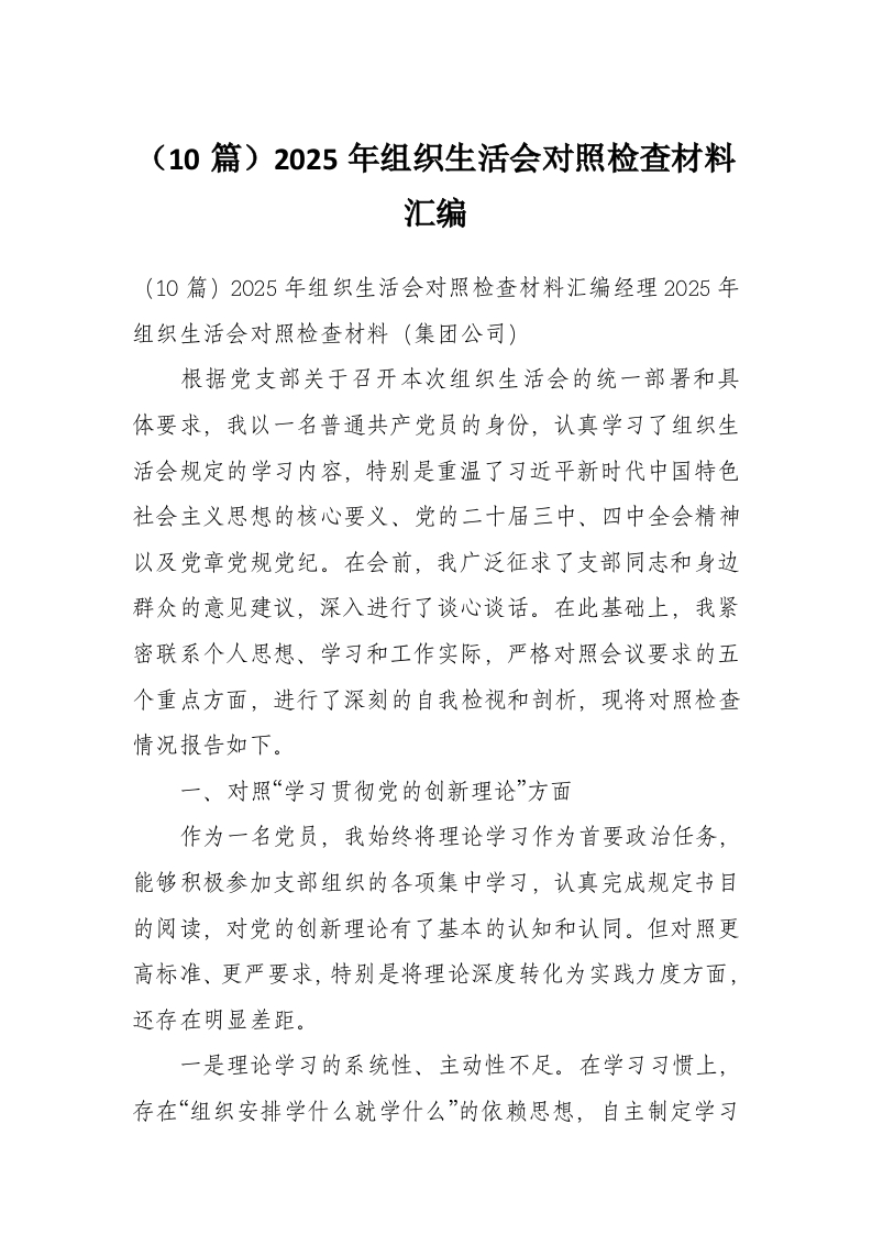 (10篇)2025年组织生活会对照检查材料汇编