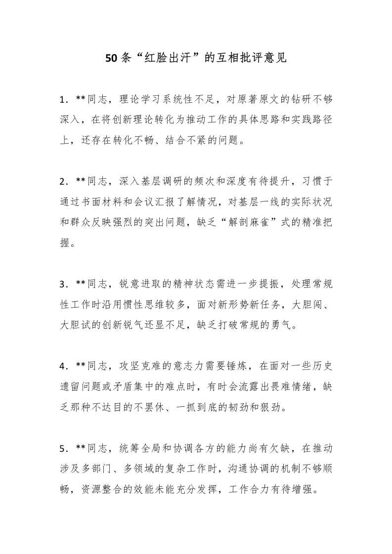 50条“红脸出汗”的互相批评意见_副本